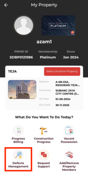 3. On My Property page, click on the “Defect Management” icon